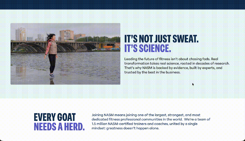 I had the privilege of working with The National Association of Sports Medicine, alongside fellow designer Isabelle Gulick. NASM came to us to update their homepage, about page, and product pages to better fit with their updated brand guidelines and conform with their new CMS platform.