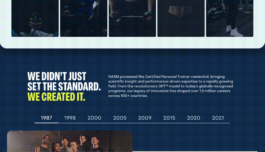 The about page presented a unique opportunity because NASM specifically requested a high level of motion and interaction. My first iteration pushed those boundaries further than I had gone in the past.